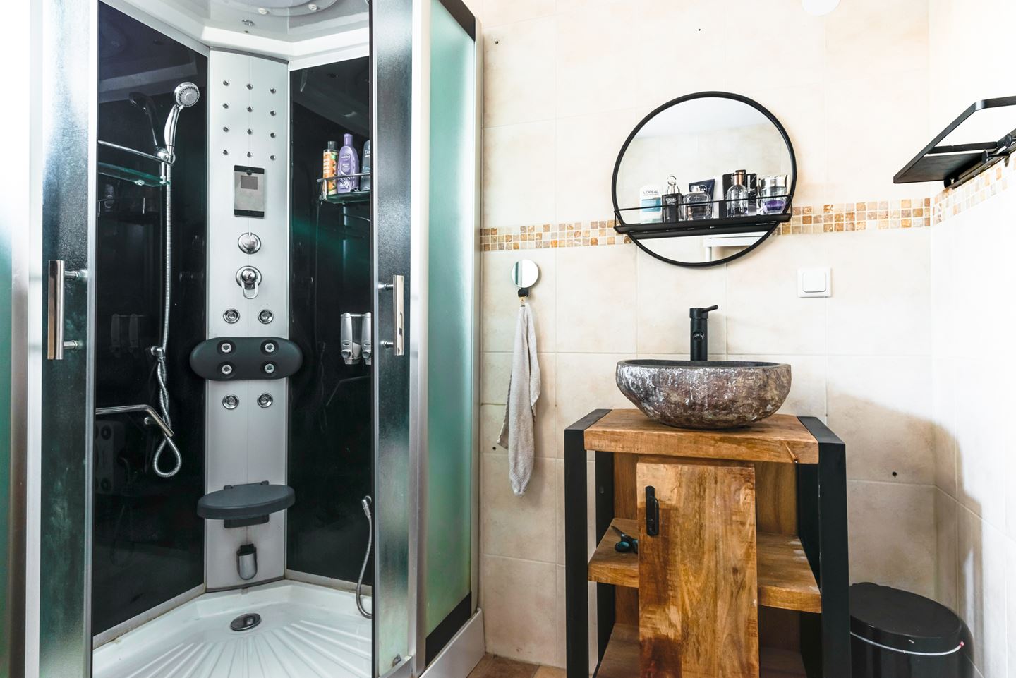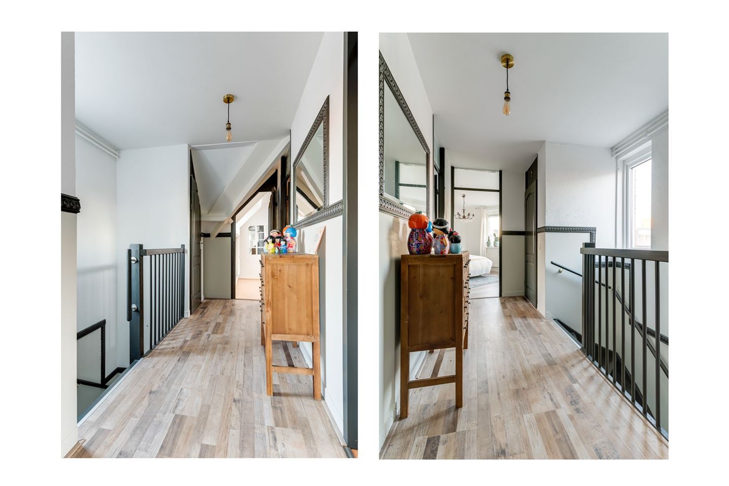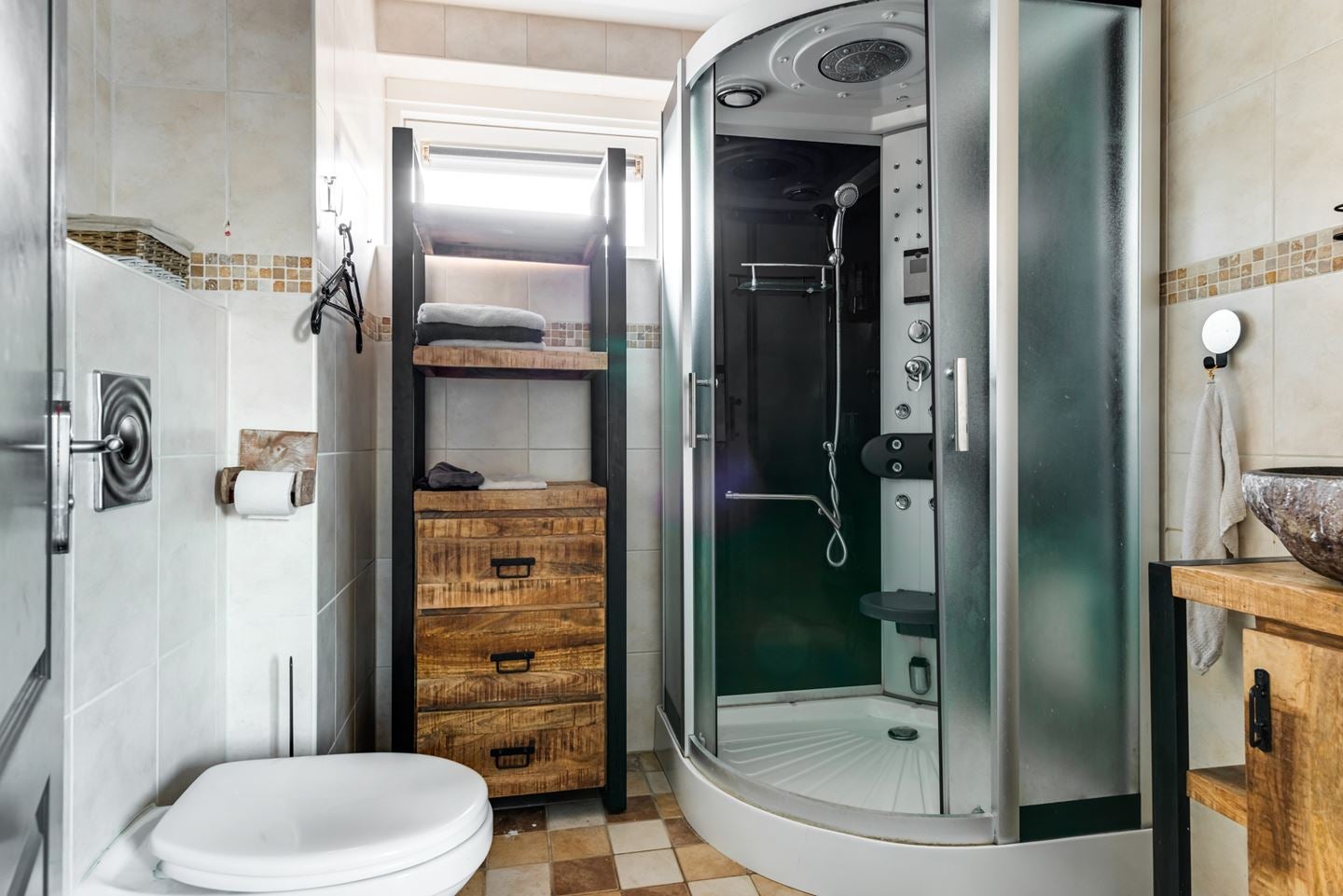 De bovenverdieping telt drie slaapkamers, waarvan twee zeer ruim en één compactere kamer, perfect als werkkamer of kinderkamer. De badkamer is een echte eyecatcher met een moderne douchecabine inclusief stoomfunctie, natuurstenen wastafel en een raam voor natuurlijk daglicht. Ook vindt u hier een stook-/bergruimte met extra opbergkast.